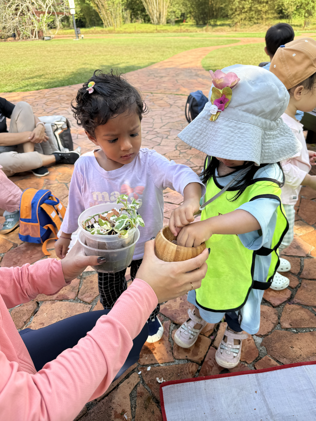 Our exploration didn’t stop there. After working with the eggs, the children carefully peeled away the shells and moved on to another hands-on experience—using a mortar and pestle to gently pound the shells into small pieces. With guidance, they then returned these crushed shells to a potted plant, sprinkling them as natural fertiliser. In this small but meaningful act, the children witnessed a beautiful cycle: what once protected life could now go on to nourish new growth. It was a powerful, age-appropriate introduction to sustainability and the idea that nothing in nature goes to waste.