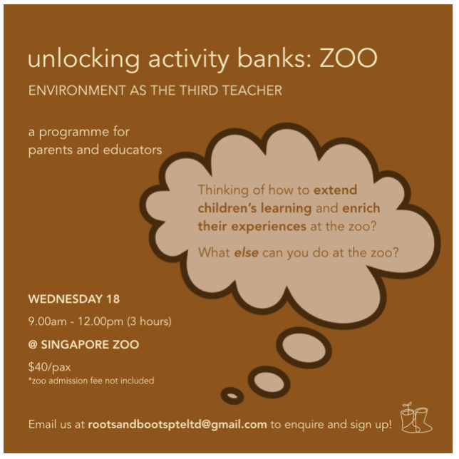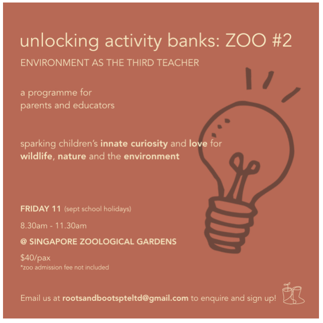 Join us during the September school holidays for another experiential, hands-on parent-educator workshop. Find out how to extend children’s learning as well as embrace our urban forest school approach at the Singapore Zoo. This time a different route (different animal exhibits, concepts and focus), but just as much fun, learning and exploration for parents and teachers alike!